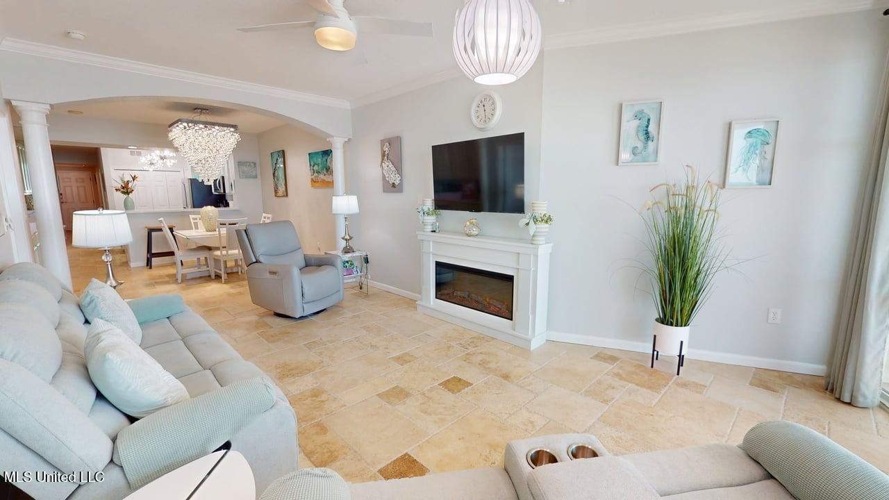 Indulge in coastal elegance with this glamorous beachfront condo at Legacy Towers in Gulfport. This beautifully appointed three-bedroom, two-bath condo offers a thoughtfully designed layout that includes a flex space perfect for a home office, bunk room, or additional storage, making it ideal for full-time living or a spacious vacation retreat. The updated kitchen is a true showstopper, featuring quartz countertops and stunning designer light fixtures that elevate the space and create a modern, upscale feel. The open living and dining areas with flow seamlessly to an expansive private balcony, where you can relax and take in phenomenal 180 degree views of the Gulf and surrounding coastline?perfect for morning coffee or sunset evenings. The spacious primary suite offers balcony access and a serene retreat with large bathroom and walk-in closet, while two additional bedrooms provide comfortable accommodations for guests or family. This attractively furnished unit is move in ready. At Legacy Towers, residents enjoy resort-style amenities including beachfront access, indoor and outdoor pools, movie theatre, fitness center, sauna, owners lounge, event hosting spaces and 24-hour security?all just minutes from dining, shopping, and entertainment on the beautiful Mississippi Gulf Coast.